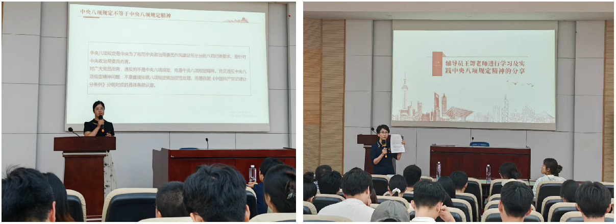 515日,三个支部联合开展深入贯彻中央八项规定精神学习教育开班仪式。学院党委副书记余小英为同学们精准剖析中央八项规定和中央八项规定精神的区别,对党员同志们起到了良好的教育作用。同时,学院辅导员王哿老师采用理论与案例相结合的方式帮助同学们进一步了解中央八项规定精神。随后,三位支部书记围绕深入贯彻中央八项规定精神学习教育为大家讲党课,进一步巩固了党员同志们对中央八项规定精神的理解。