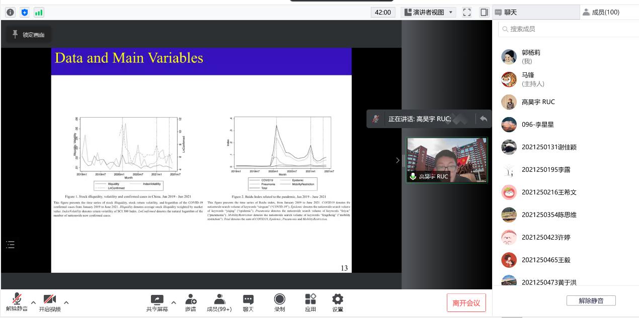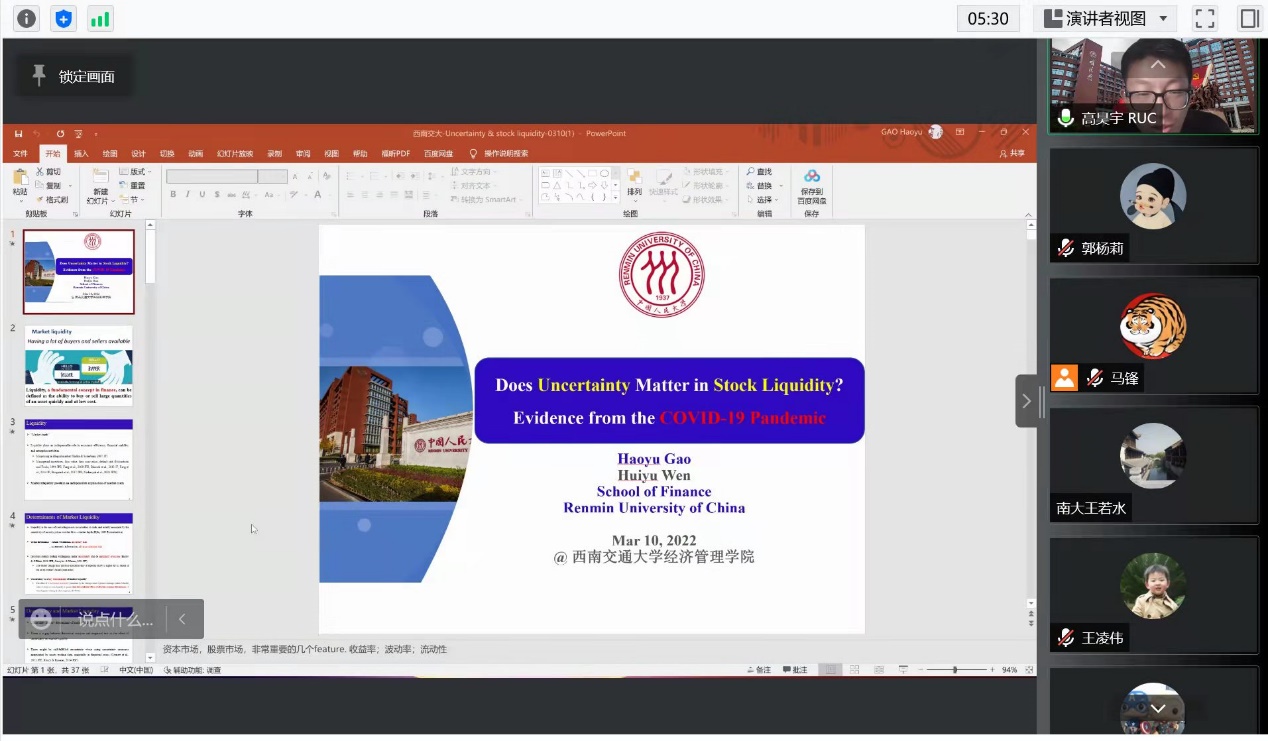 2022年3月10日上午10点,中国人民大学财政金融学院高昊宇副教授的学术讲座在线上举行。高昊宇副教授以“Does Uncertainty Matter in Stock Liquidity? Evidence from the COVID-19 Pandemic”为主题进行了精彩的分享。本次学术活动由经济管理学院马锋副教授主持,朱宏泉教授、梁超老师以及学院部分研究生在线参加了本次讲座。