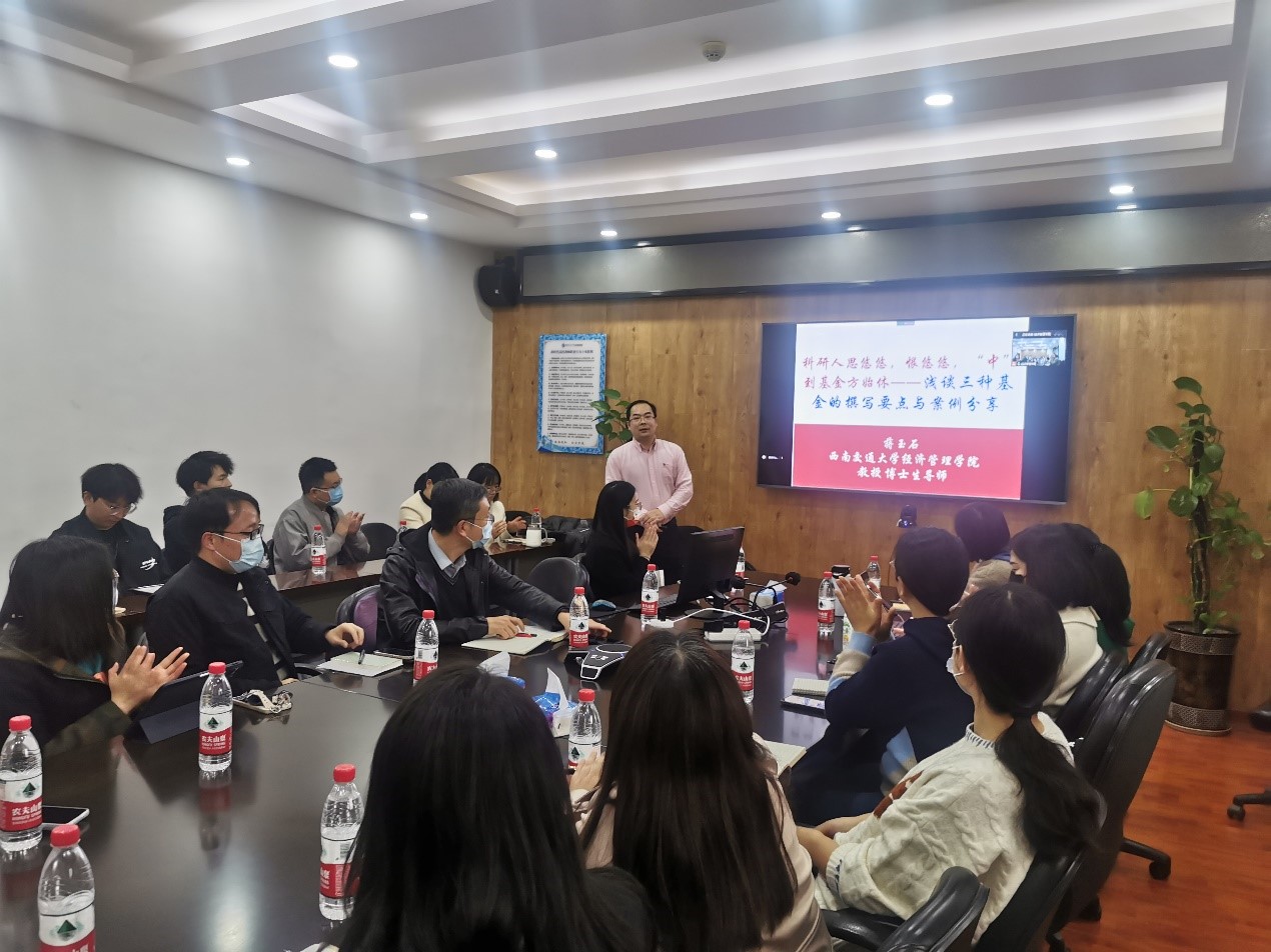 2022年11月24日下午3点,学院在九里校区信息楼0607召开2023年基金申报交流会(第二场)。受疫情影响,此次会议采取线上线下相结合的方式,全院40余位教师和博士生参加会议。会议由经济管理学院党委书记王斌主持,我院市场学系蒋玉石教授分享了申报教育部人文社科基金、国家社会科学基金和国家自然科学基金项目的经验。
