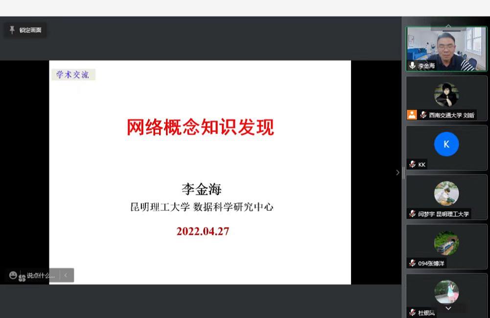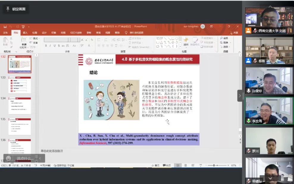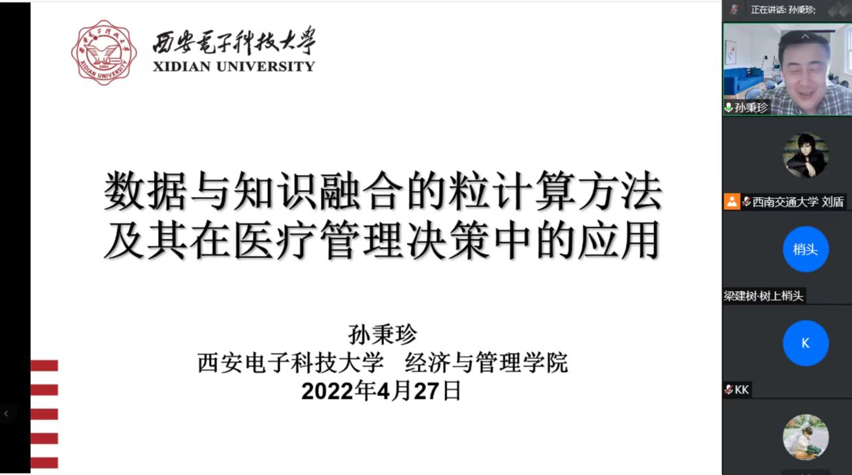 2022年4月27日下午2点,西安电子科技大学孙秉珍教授和昆明理工大学李金海教授应邀在腾讯会议上分别开展了题为“数据与知识融合的粒计算方法及其在医疗管理决策中的应用”、“网络概念知识发现”的线上学术报告。经济管理学院信息系统与运营管理系刘盾教授主持了此次讲座,校内外师生100余人参加了此次学术交流。