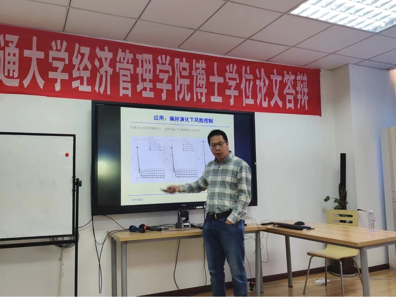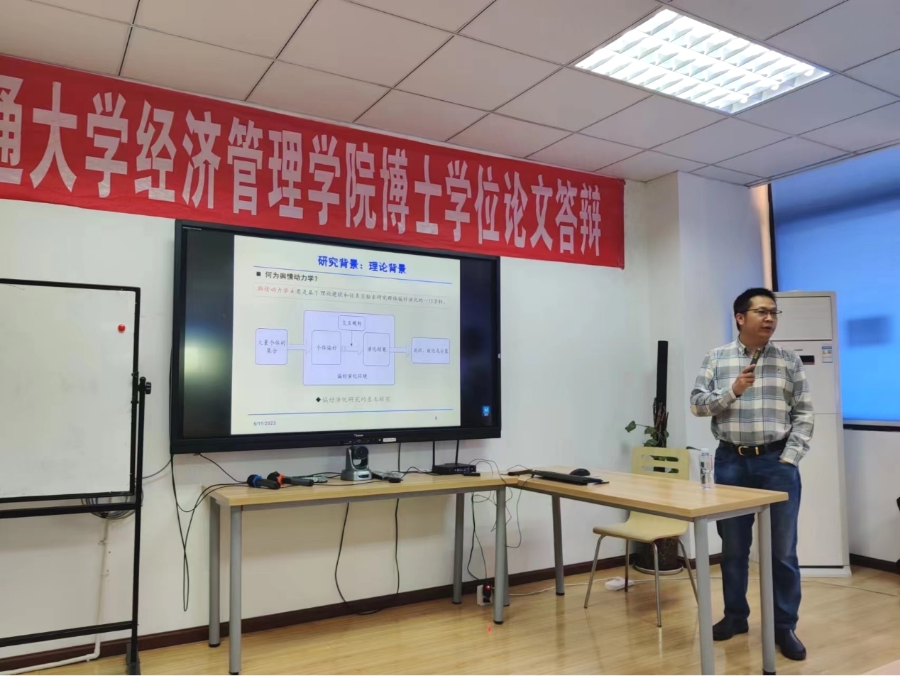 董教授主要从舆情的研究背景、基于DG模型的社会网络共识结构和基于HK模型的不确定观点演化机制这三个方面进行了学术探讨。其中社会网络DG模型主要从群体偏好形成共识的社会网络结构和网络最小调整的公式引导策略两个方面展开,得到增加最少信任连接能促进群体共识并且不改变个体原始观点的结论;不确定性观点的演化机制则主要从不确定性演化机制、线上线下偏好异步演化机制探讨以及虚伪交互与群体偏好演化三方面展开,指出个体观点的不确定性和观点的不确定程度会对舆情演化产生影响。