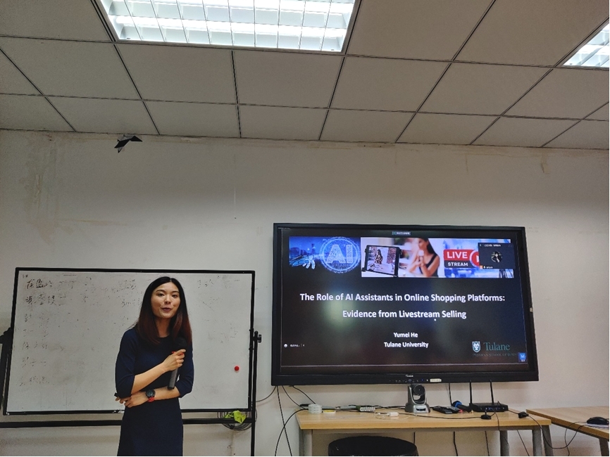 2023年6月16日上午,杜兰大学弗里曼商学院助理教授何玉梅应邀在学院0411室开展题为“The Role of AI Assistants in Livestream Selling: Evidence from a Randomized Field Experiment”的学术讲座。讲座由学院信息系统与运营管理系刘盾教授主持,我院教师徐进副教授、陈瑾轩老师,电子科技大学经济与管理学院钱宇副教授、四川农业大学商旅学院李良强老师,以及学院40名研究生参与了此次学术活动。