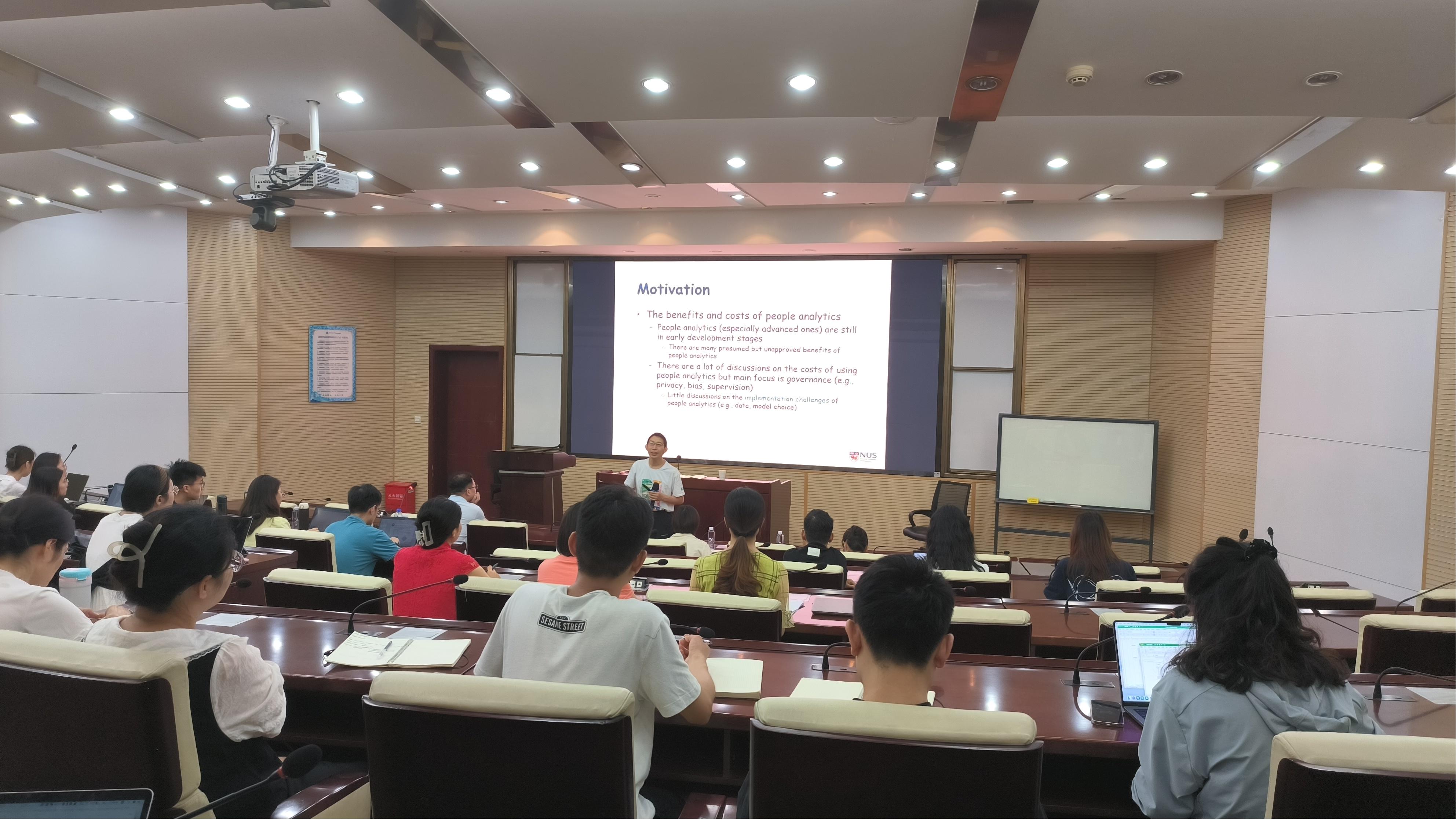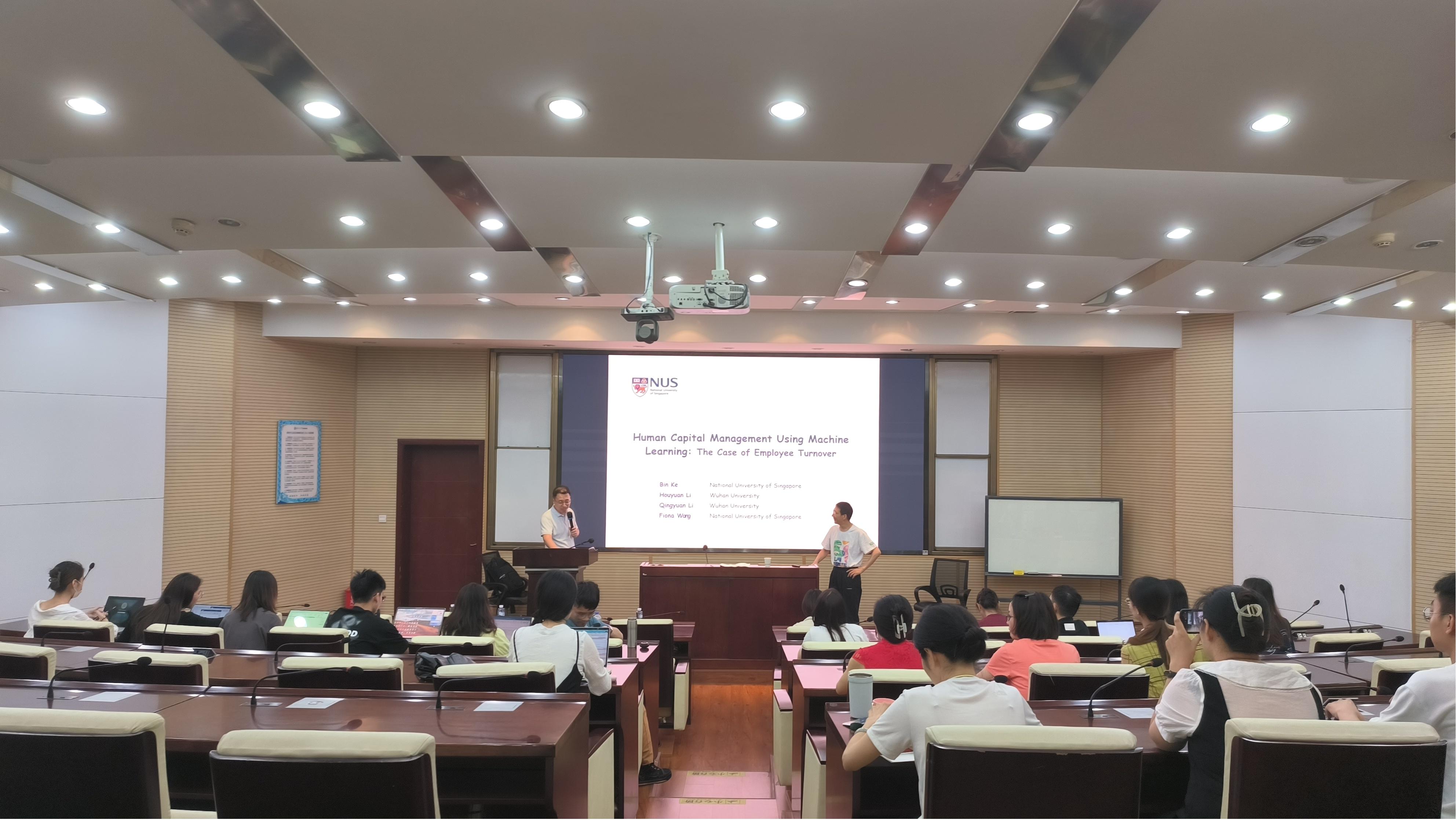 学院参会人员介绍了李青原教授的研究方向和学术成就。然后, 李青原教授从构建机器学习模型预测雇员离职的研究目标出发, 阐述了研究动机和问题。 他从预测员工离职率的重要性和传统人力资源管理的局限性两个角度解释了研究动机,进而引出了具体的研究问题。