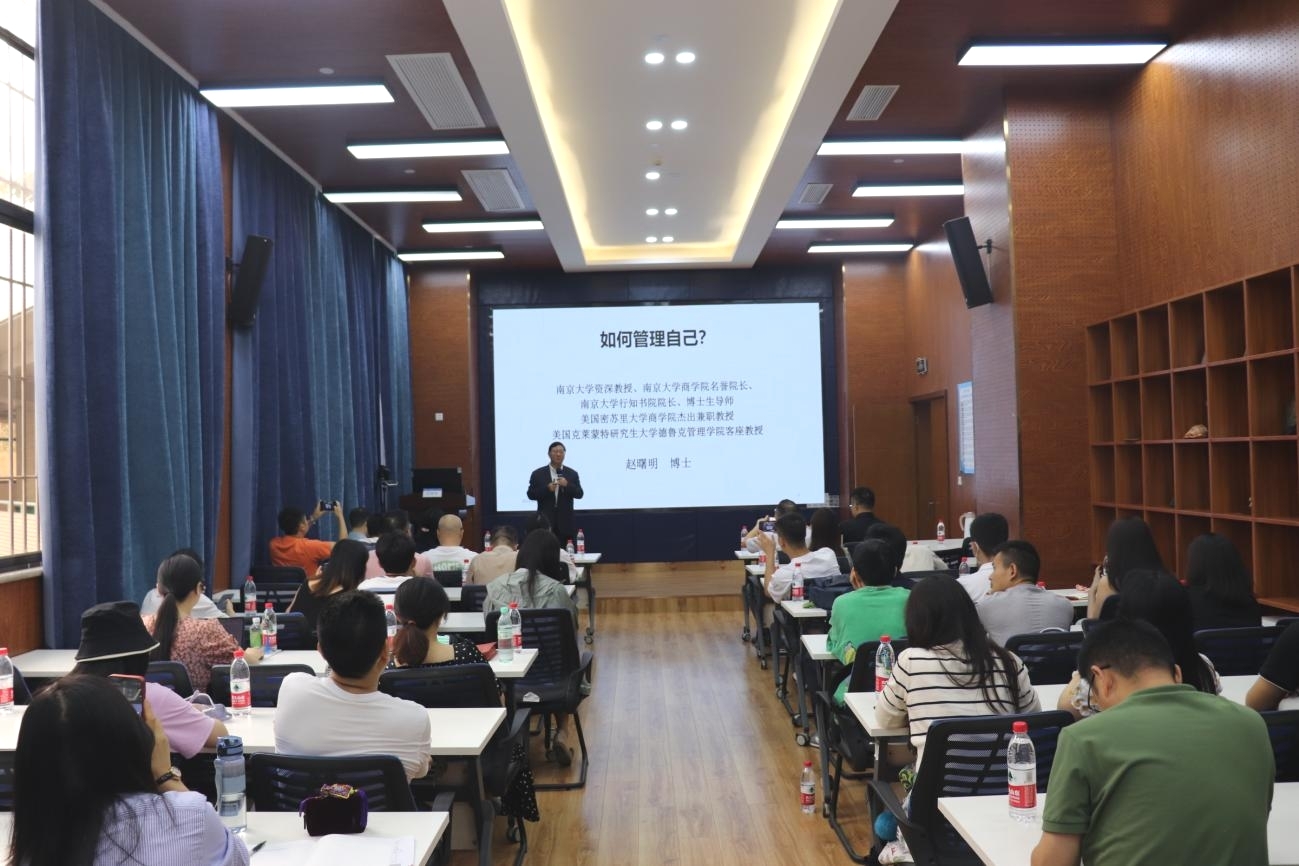 2023年6月23日上午,我院邀请教育部工商管理类学科专业教育指导委员会副主任委员、中国管理研究国际学会第三任主席、中国管理现代化研究会副会长、中国人力资源开发研究会副会长,南京大学人文社会科学资深教授、南京大学商学院名誉院长、南京大学行知书院院长、博士生导师赵曙明教授到我校作题为《如何管理自己》的专题学术报告。本次讲座由经济管理学院副院长聂佳佳教授主持,学院部分老师和同学参与了此次学术活动。经济管理学院执行院长郭强致欢迎辞并对赵曙明教授进行了隆重介绍,并对赵曙明教授的到来表示热烈的欢迎和感谢。