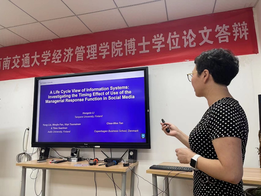 2023年9月15日上午9:30,芬兰坦佩雷大学管理与商业学院黎红秀副教授应邀为我院师生进行题为“Dissipating the benefits of Information systems over time: Exploring the timing effect of customer-facing technologies”学术报告。本次学术活动由经济管理学院市场系蒋玉石教授主持,学院部分老师和同学参与了此次学术活动。学院执行院长郭强教授对黎红秀副教授的学术成果进行了介绍,同时对黎教授的到来表示热烈的欢迎和感谢。