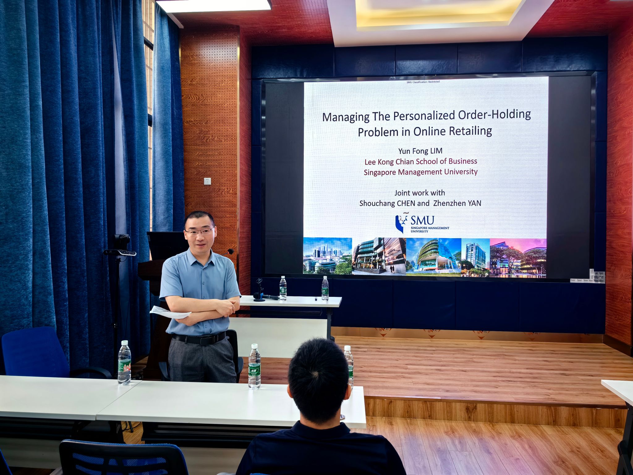 2024年4月25日新加坡管理大学林云峰教授应邀在学院0218室为我院师生作了题为“Managing The Personalized Order-Holding Problem in Online Retailing”的学术讲座。本次学术活动由学院副院长聂佳佳教授主持,学院院长韩科及部分教师、研究生参加了此次学术活动。聂佳佳教授首先对林云峰教授的学术成果进行了介绍,同时对林云峰教授的到来表示真挚的感谢!