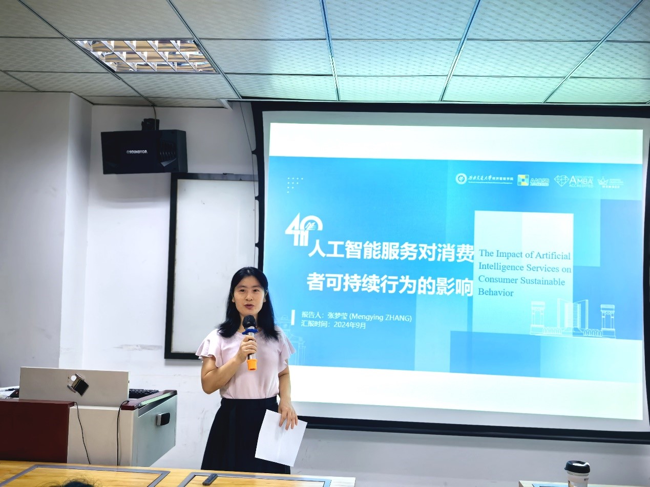 2024年9月27日上午10点,西南交通大学九里校区零号楼0302室举办了新青年教师系列讲座。本次讲座邀请了经济管理学院市场学系的助理教授张梦莹博士,围绕“人工智能服务对消费者可持续行为的影响”这一主题展开,学院部分师生到场聆听,讲座由市场学系副系主任范春梅副教授主持。