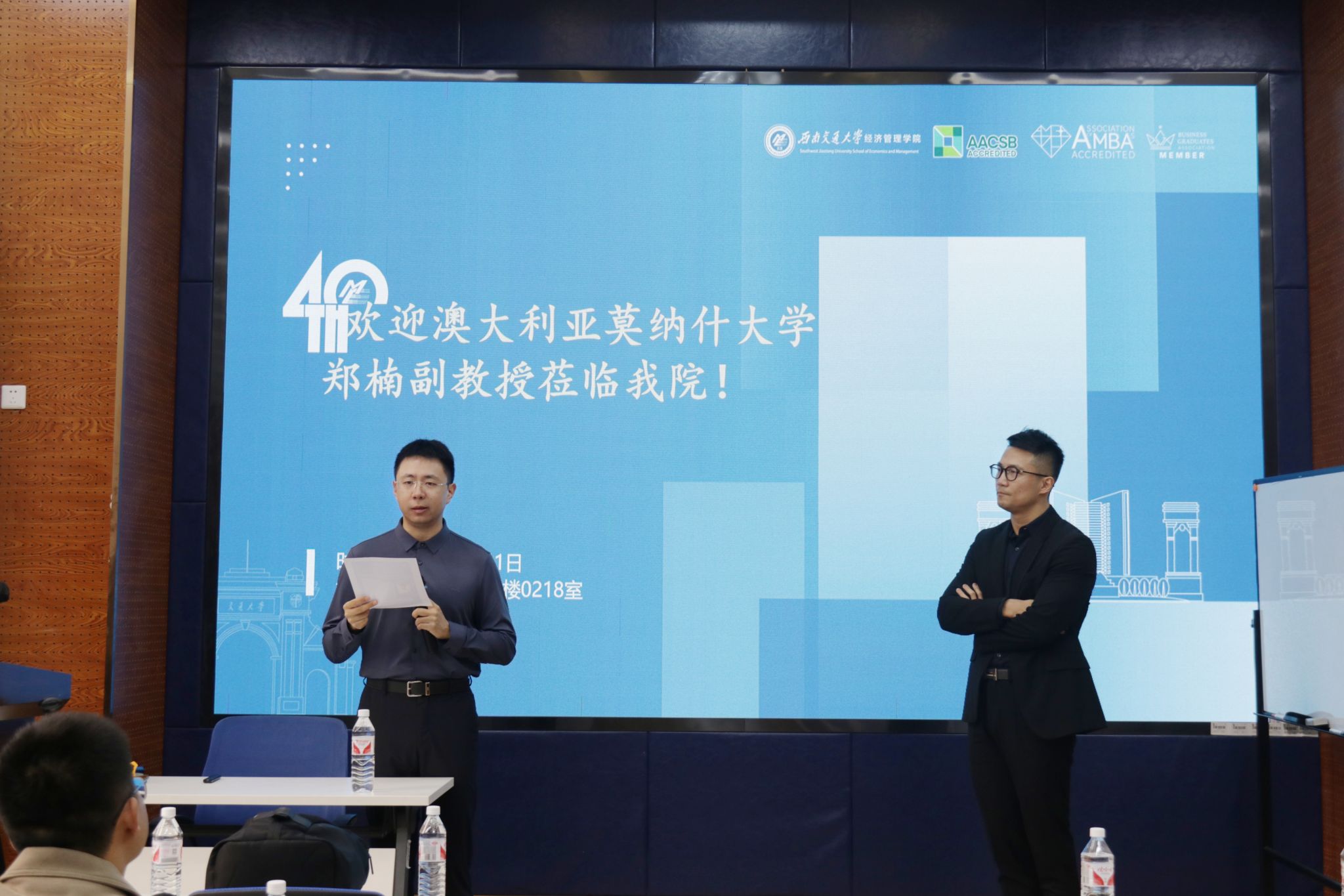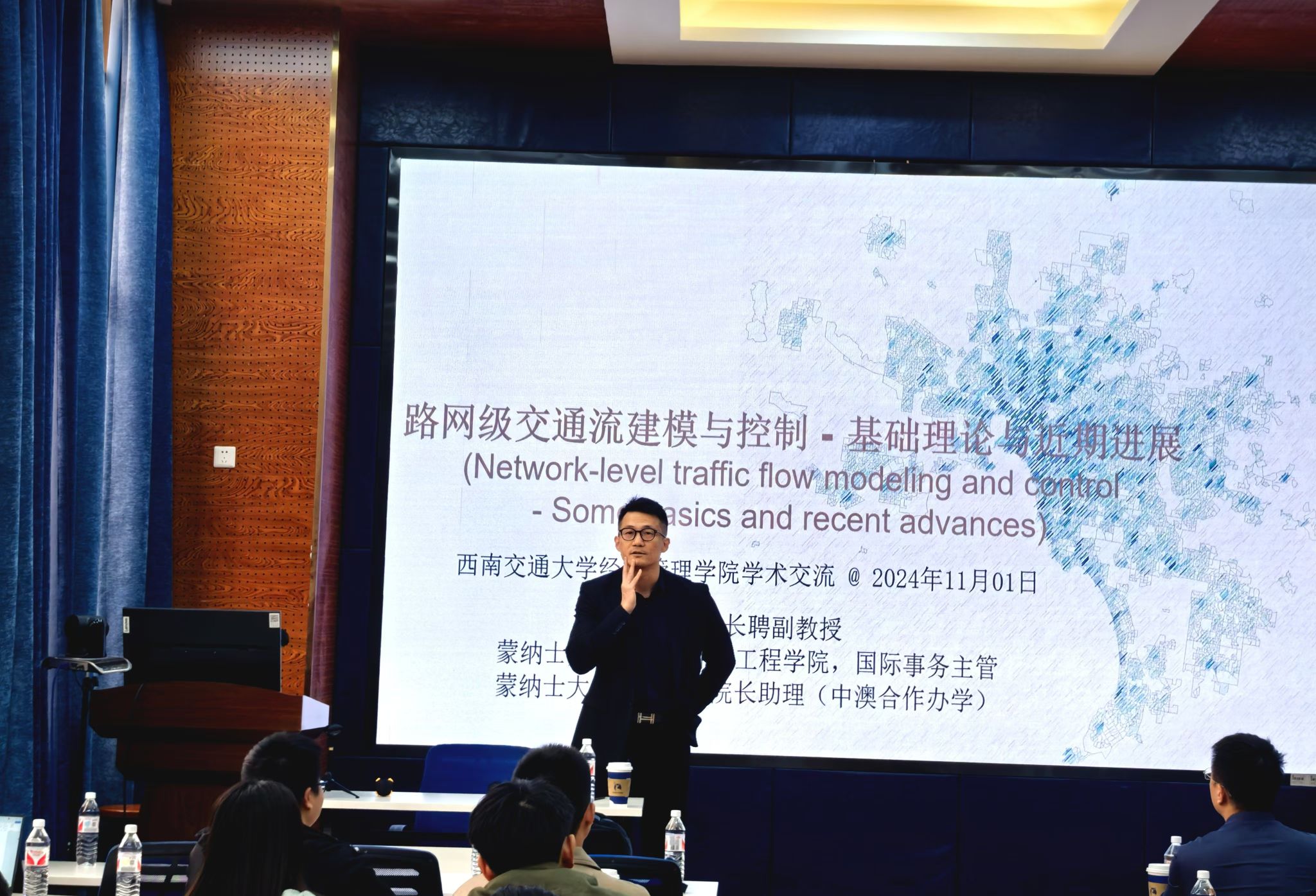 2024年11月1日上午,特邀国际知名的交通流研究专家、莫纳什大学副教授郑楠应邀在经济管理学院为师生带来了一场主题为“网络级交通流建模与控制-宏观基本图模型特性与相关研究进展”的校外学者系列讲座。本次学术活动由经济管理学院院长韩科主持,经济管理学院及交通运输与物流学院相关专家、老师、研究生共80余人参与此次学术交流活动。学院院长韩科对郑楠副教授的学术背景与成就进行了介绍,并代表学院对郑楠副教授表示欢迎与诚挚的感谢。