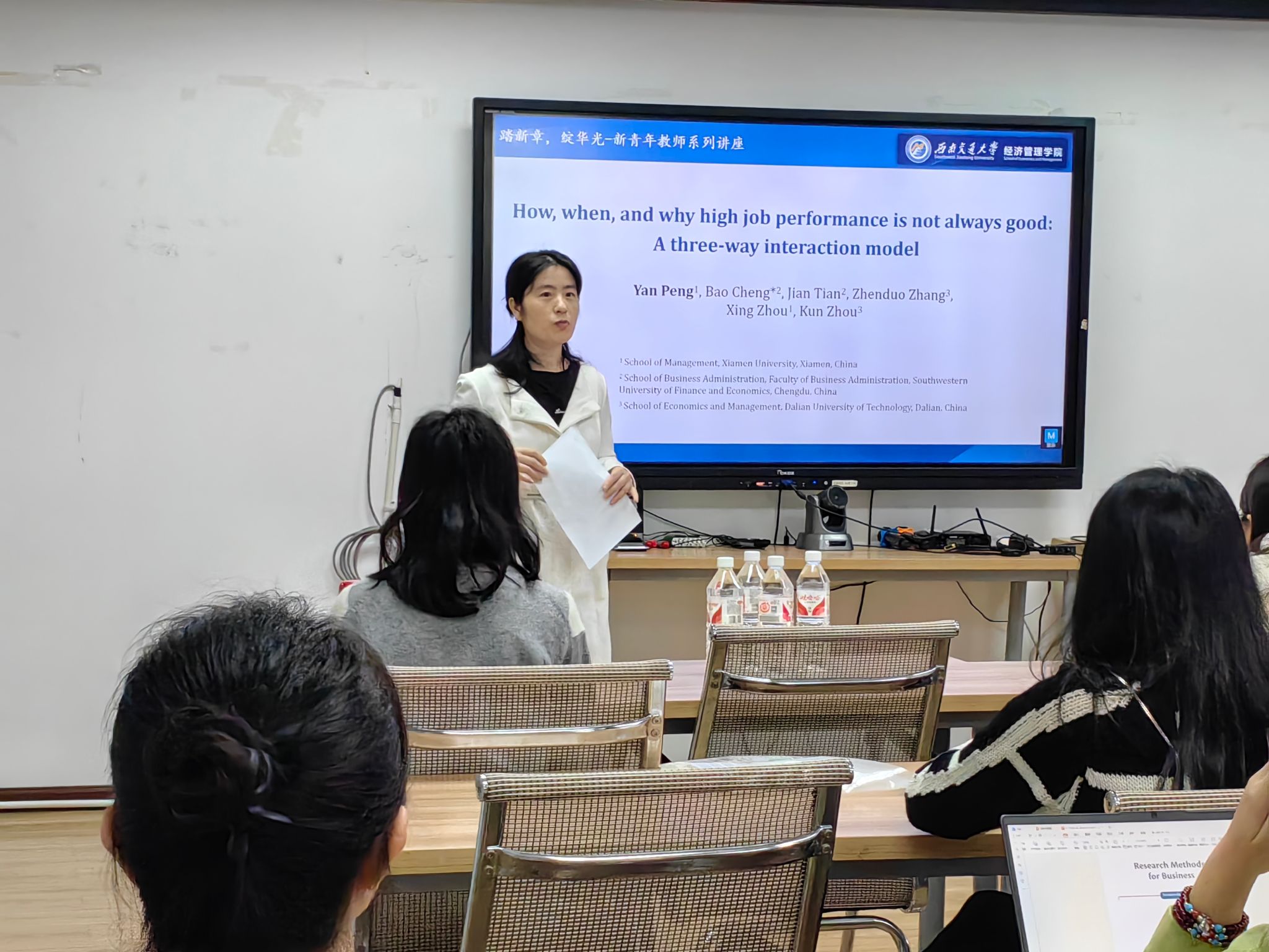 2024年11月1日,西南交通大学九里校区零号楼0411室成功举办了新青年教师系列讲座。本次讲座邀请经济管理学院创新创业与管理学系助理教授彭艳博士主讲,主题为“How, when, and why high job performance is not always good: A three-way interaction model”讲座吸引了学院众多硕博研究生及对组织行为学有浓厚兴趣的老师参与,由经济管理学院市场学系副主任范春梅副教授主持。