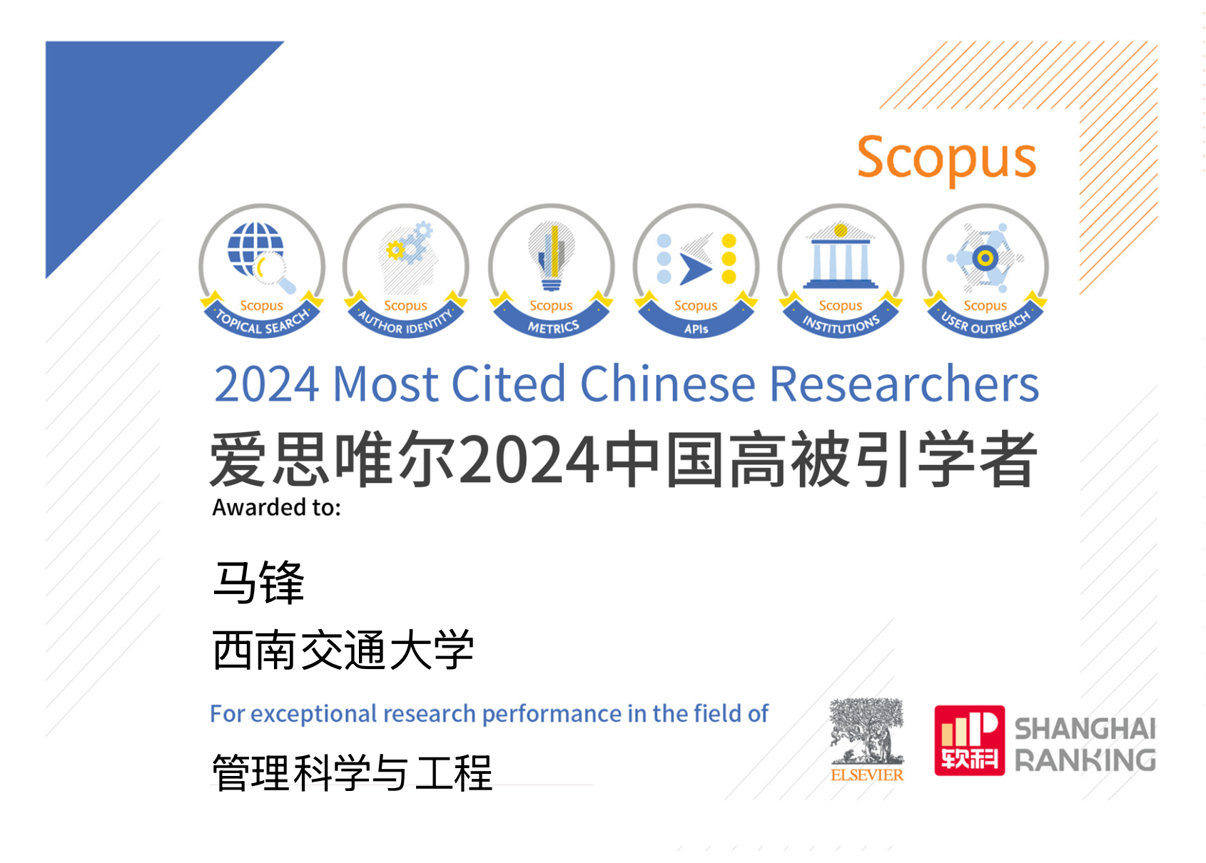 2025年3月25日,爱思唯尔(Elsevier) 重磅发布2024中国高被引学者 (Highly Cited Chinese Researchers)榜单。西南交通大学经济管理学院马锋教授和梁超副教授入选管理科学与工程领域中国高被引学者。这是马锋教授连续第五年、梁超副教授首次入选该榜单。