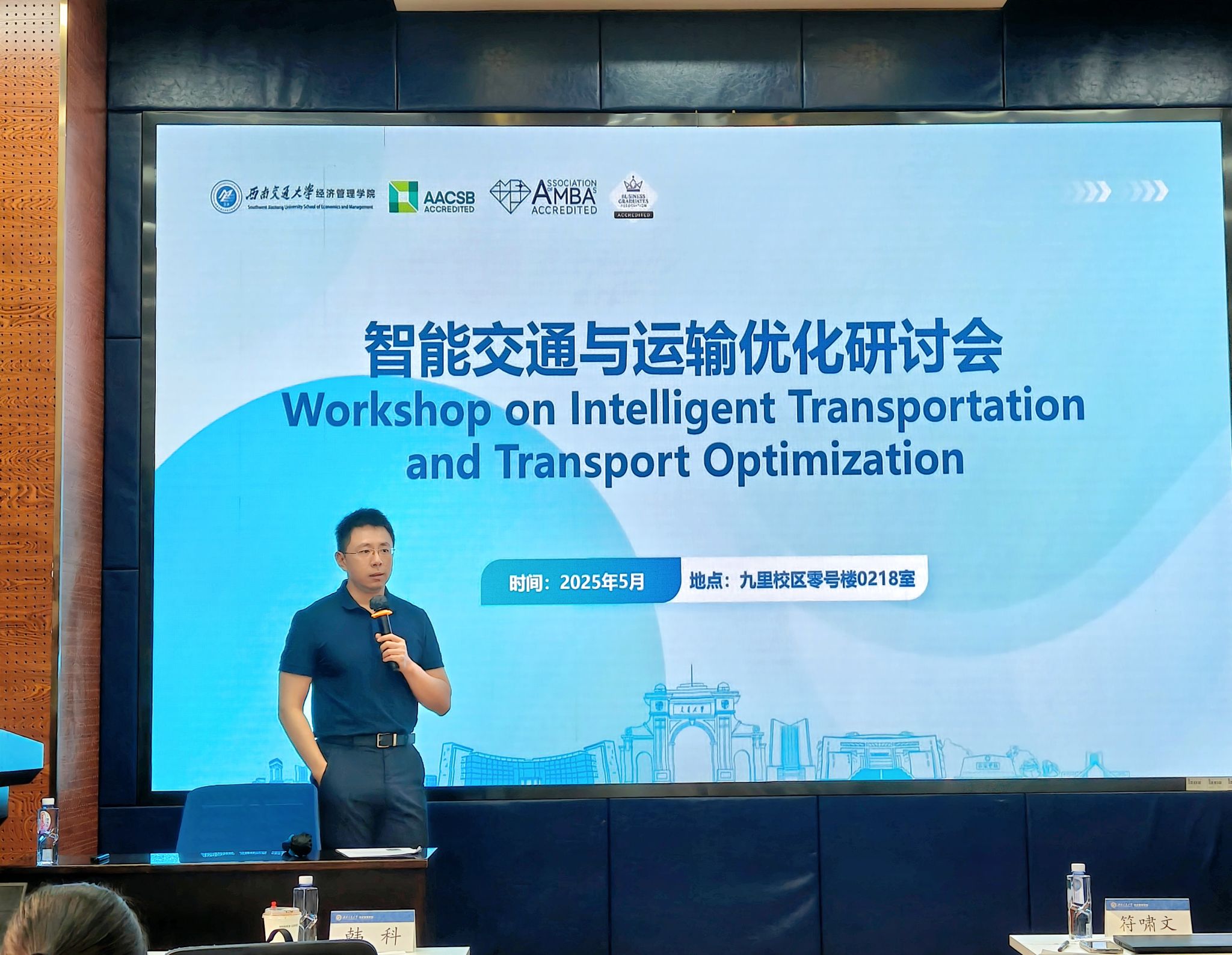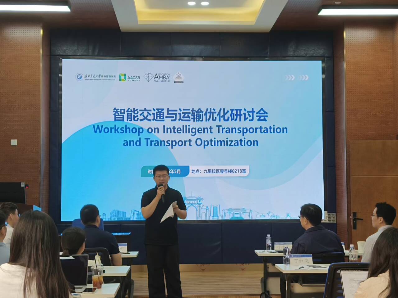 为推动智能交通与运输优化领域的学术交流与合作,西南交通大学经济管理学院于2025年5月9日上午9:30在九里校区零号楼0218室成功举办“智能交通与运输优化研讨会(Workshop on Intelligent Transportation and Transport Optimization)”。本次研讨会由西南交通大学经济管理学院院长韩科主持,特邀来自香港理工大学、西交利物浦大学及韩国科学技术院(KAIST)的四位专家学者,共同围绕智能交通系统、运输优化技术等前沿课题展开深入探讨。