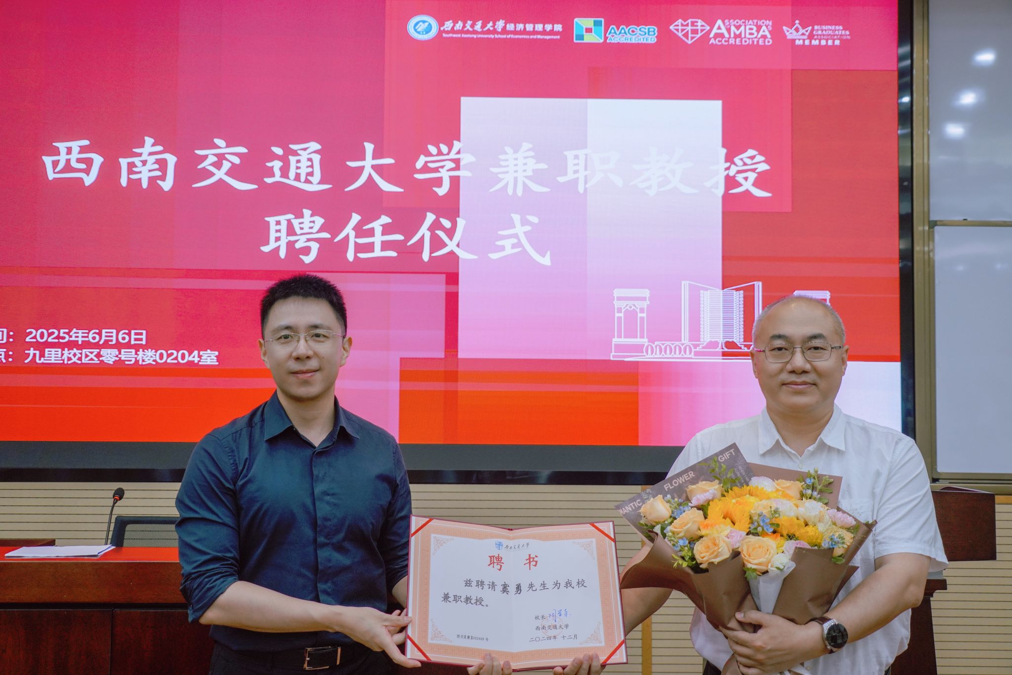 2025年6月6日下午,经济管理学院于0204会议室举行窦勇兼职教授聘任仪式暨城市地下管网建设专题讲座。经济管理学院院长韩科为窦勇颁发西南交通大学兼职教授聘书,并对窦勇教授加入我校表示热烈欢迎。