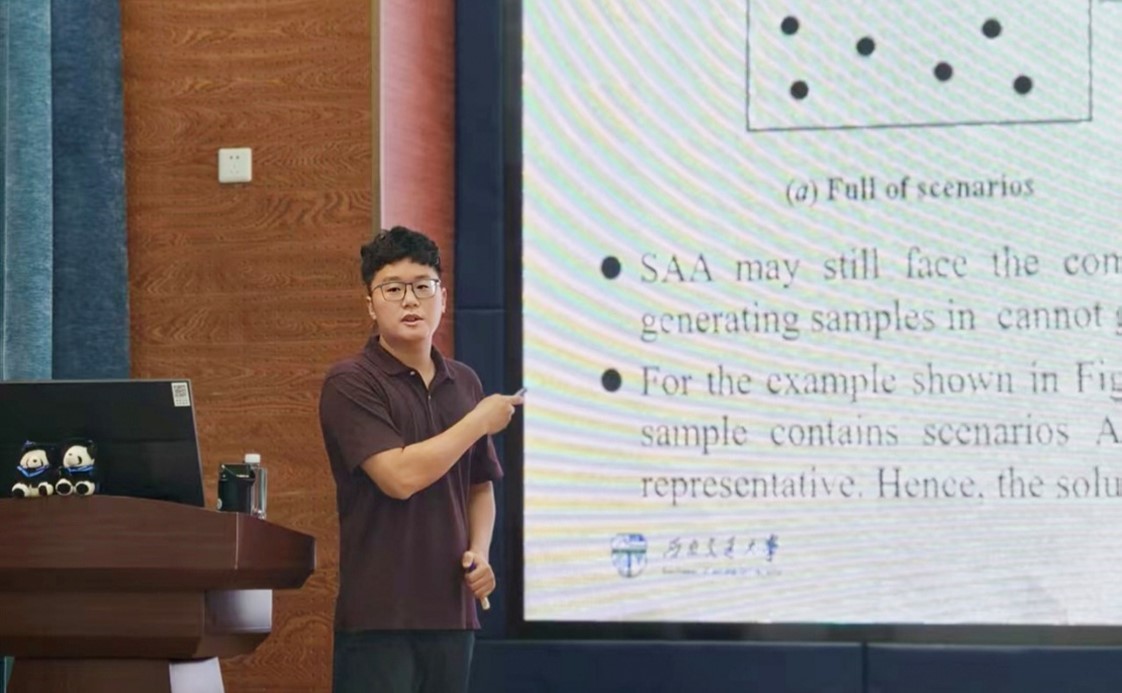 7月8日下午,西南交通大学经济管理学院胡少龙老师带来题为《基于情景聚类的优化算法设计——以求解两阶段随机规划模型为例》的精彩讲座。此次讲座聚焦应急物流网络中的选址-库存联合决策问题,运用两阶段随机规划处理不确定性。为克服该规划因情景众多导致的计算难题,讲座重点介绍了结合情景聚类等改进方法,通过聚合相似情景有效提升求解效率。