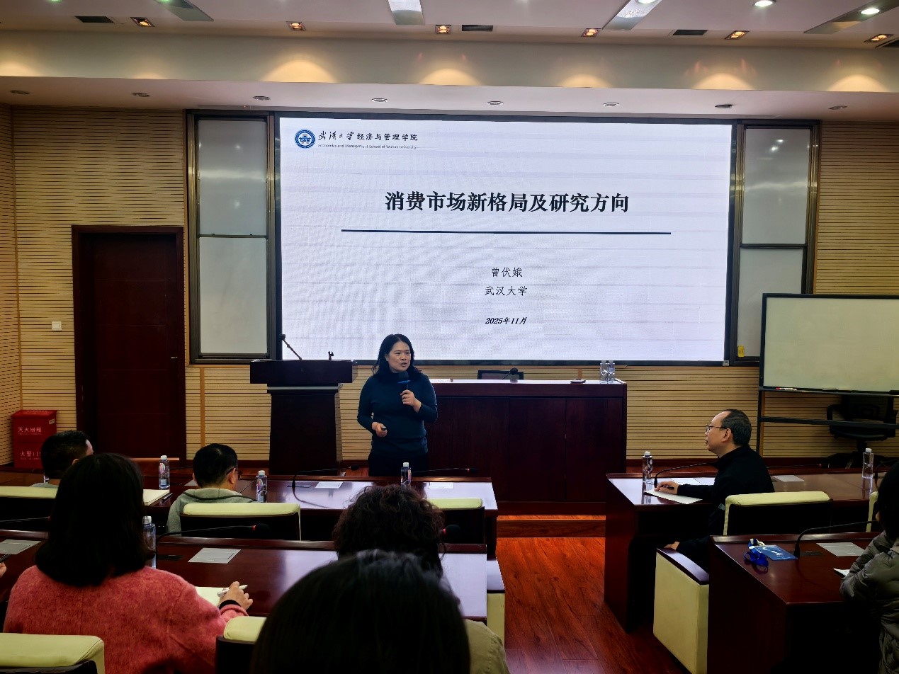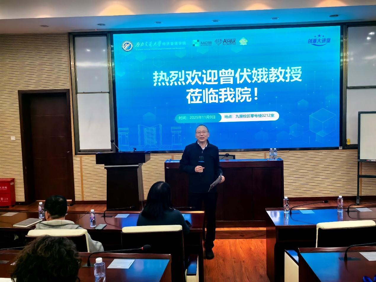 2025年11月9日下午,西南交通大学经济管理学院“创源大讲堂”之“经世致用 雅集新篇”校外学者系列讲座,于九里校区零号楼0212室圆满举办。此次讲座由武汉大学经济与管理学院曾伏娥教授主讲,讲座题为:“消费市场新格局及研究方向”。我院副院长李良教授主持本次讲座,学院师生踊跃参与。