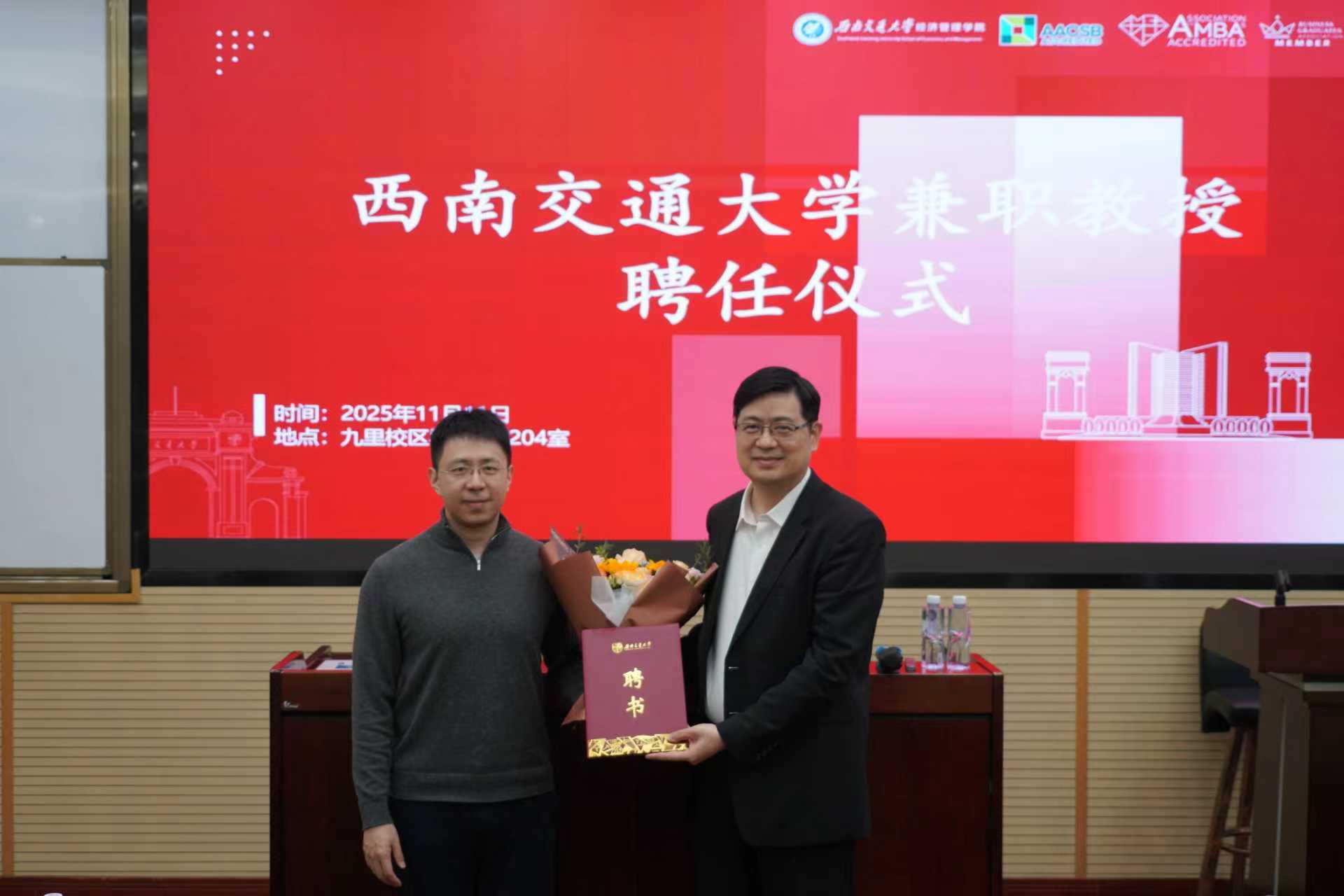 2025年11月11日上午,经济管理学院于九里校区0204室举行香港理工大学工业与系统工程系符啸文教授兼职教授聘任仪式暨航空枢纽建设前沿议题讲座。本次活动由学院院长韩科教授主持。韩科院长为符啸文教授颁发西南交通大学兼职教授聘书,并对符啸文教授加入我校表示热烈欢迎。