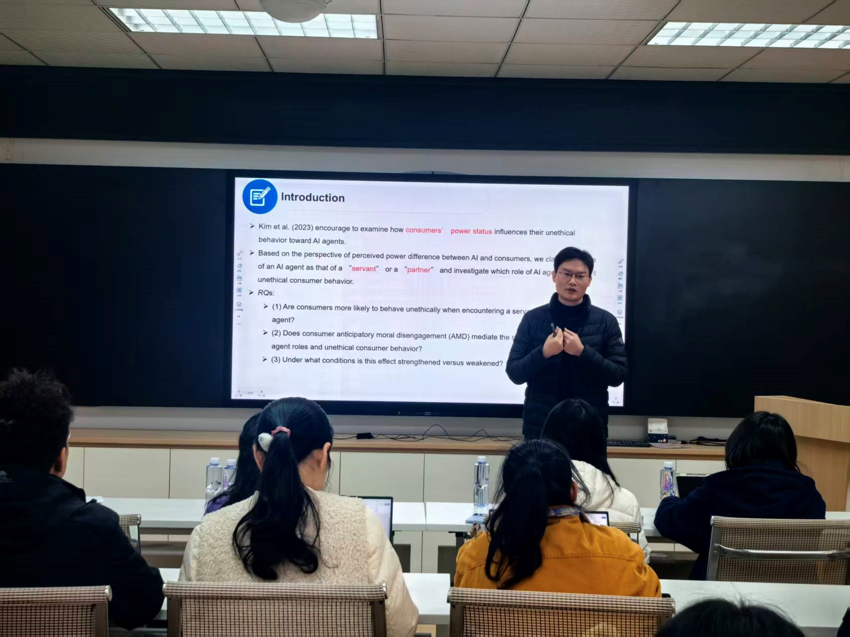 本次讲座围绕雷老师发表于国际服务研究领域权威期刊《Journal of Service Research》的研究成果展开,论文主题为 “Unethical Consumer Behavior Following Artificial Intelligence Agent Encounters: The Differential Effect of AI Agent Roles and Its Boundary Conditions”。讲座中,雷老师深入解析了研究的初衷与核心动机,系统阐释研究依托的理论框架与采用的科学方法,并结合自身经历分享论文投稿过程中面临的挑战、关键问题及实用解决策略,为与会师生的学术研究与论文发表提供宝贵参考。