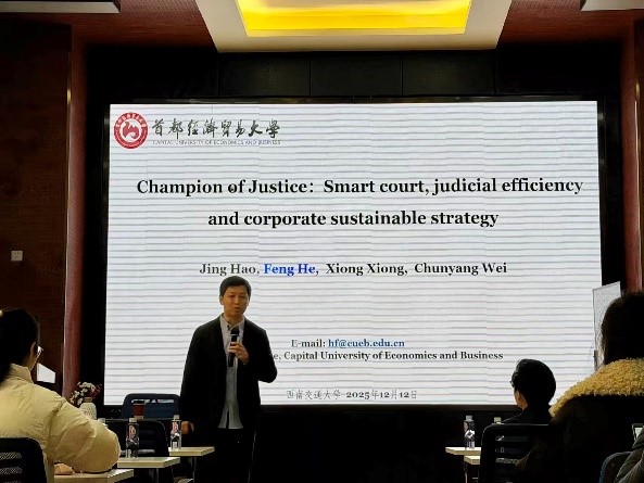2025年12月12日上午,首都经济贸易大学金融学院何枫教授应邀在九里校区零号楼0218室为我院师生作题为“Champion of Justice: Smart Court, Judicial Efficiency and Corporate Sustainable Strategy”的学术讲座。此次讲座由学院马锋副院长主持,学院部分教师及研究生参加了此次讲座,马锋副院长首先对何枫教授的学术成果进行了介绍,同时对何教授的到来表示热烈的欢迎与感谢。