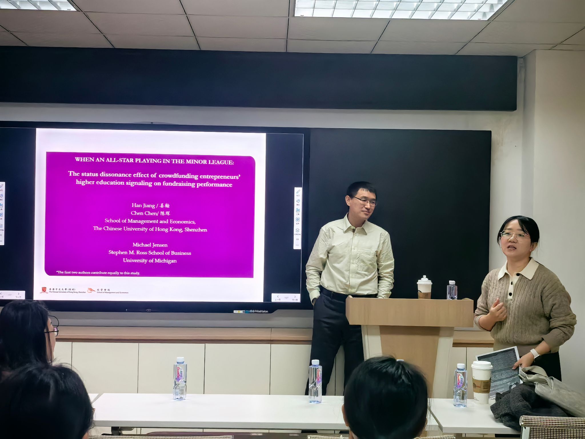 2025年12月23日上午,香港中文大学(深圳)经管学院姜翰副教授应邀为我院师生带来一场题为“An All-star Starting to Play in the Minor League: The Status Dissonance Effect of Crowdfunding Entrepreneurs’ Educational and Professional Rhetoric on Fundraising Performance”的学术讲座。本次讲座由经济管理学院创新创业与管理学系陈轩瑾老师主持,学院部分师生参加了此次活动。讲座伊始,陈老师介绍了姜老师的学术背景与成就,并对姜老师的到来表示热烈欢迎。