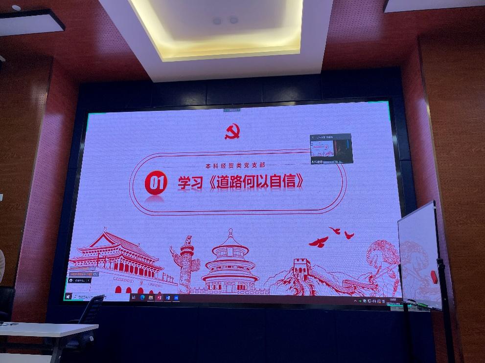 经济管理学院本科经贸类党支部于11月11日通过线上方式,开展了“学习《道路何以自信》”的主题党日活动。此次活动由党支部书记陈建奇同志主持,全体支部党员参加,积极分子列席参加。
