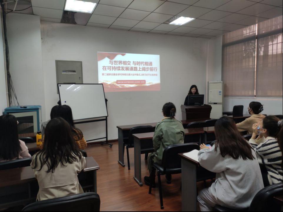 第二届联合国全球可持续交通大会于2021年10月14日至16日以线上线下相结合方式在北京举行。10月14日晚,国家主席习近平以视频方式出席第二届联合国全球可持续交通大会开幕式并发表题为《与世界相交 与时代相通 在可持续发展道路上阔步前行》的主旨讲话。2021年10月21日14时,经济管理学院硕士2020级第一党支部在九里校区0217教室,开展了“习近平主席在第二届联合国全球可持续交通大会开幕式上的主旨讲话”的专题学习。本次会议由支部内的魏倩倩同志进行主讲,支部内15名党员参与活动。