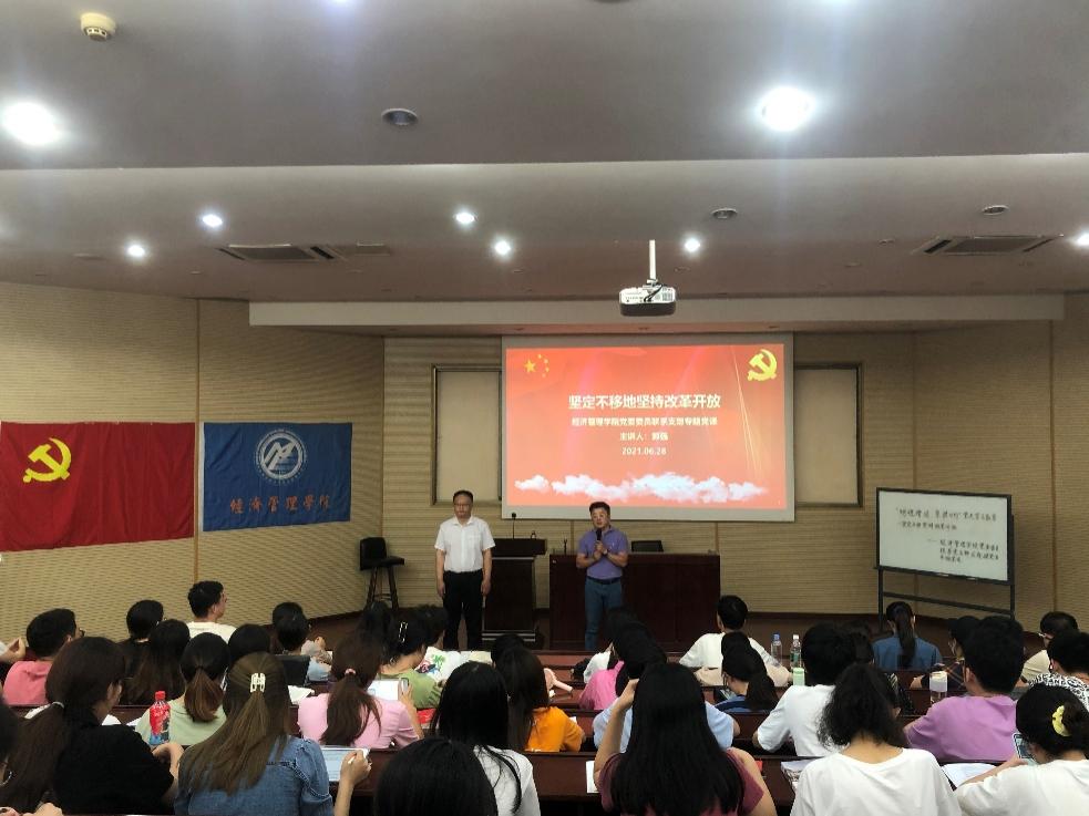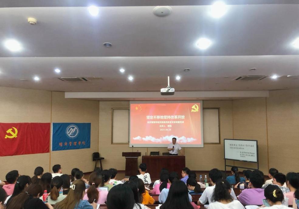 2021年6月28日晚,在0202教室,经济管理学院执行院长郭强同志以“坚定不移地坚持改革开放”为主题,讲授了庆祝建党百年专题微党课。参加本次党课的有学院本科经贸类党支部成员、2018级博士党支部和工程管理系教工支部成员。