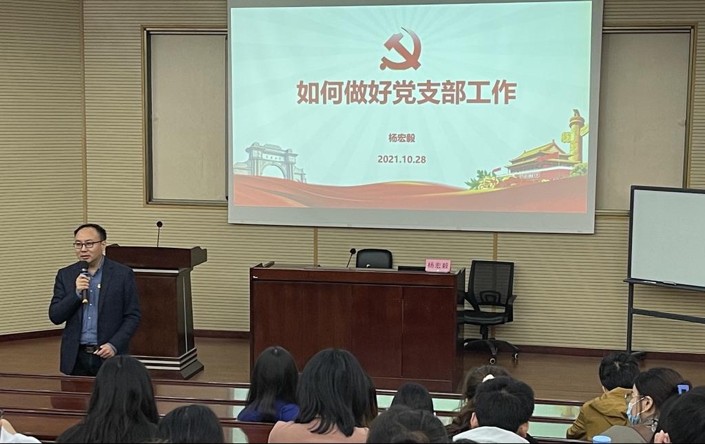 学院党委副书记杨宏毅从四个方面向各党支部委员们系统讲解了如何做好党支部工作。他首先详细解读了党支部的设置,支委会的选举、任期、流程以及各个党支部委员职责等内容。他强调,党支部书记要高度重视自己的带头作用,要带领本支部党员扎实开展好各项工作和活动。接着,他对党支部“三会一课”制度进行了强调,对党支部开展的各种活动类别进行了详细的介绍,加深了党支部委员们特别是2021级新生党支部委员们对党建工作的理解和认识。在第三部分,杨宏毅按照《中国共产党发展党员工作细则(试行)》系统介绍了发展党员的流程及注意事项,并要求党支部委员要进一步明确自己的工作职责,树立好工作信心,认真学习党支部各项工作条例及工作要求,严格把好发展党员的标准和流程,注意党员发展的各个时间节点,按要求及时做好归档等工作。最后,杨宏毅举例说明了党支部工作和发展党员过程中常见的各种问题,并现场对各种党建工作疑题进行了解答。