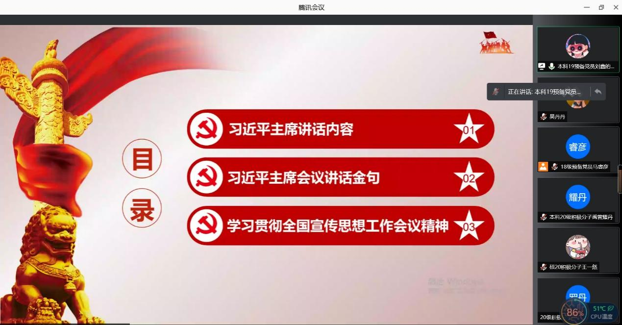本次专题学习活动主要分为三个部分:一、学习“宣传思想工作专题”;二、学习“十九届六中全会”主要内容;三、苏扬老师进行学习总结。专题学习活动开始,首先由本科管理类党支部19级预备党员刘鑫从带领大家共同学习“宣传思想工作专题”,学习内容为习近平总书记讲话内容、习近平总书记会议讲话金句和学习贯彻全国宣传思想工作会议精神三方面。讲话强调:完成新形势下宣传思想工作的使命任务,必须以习近平新时代中国特色社会主义思想和党的十九大精神为指导,增强“四个意识”、坚定“四个自信”,自觉承担起举旗帜、聚民心、育新人、兴文化、展形象的使命任务。