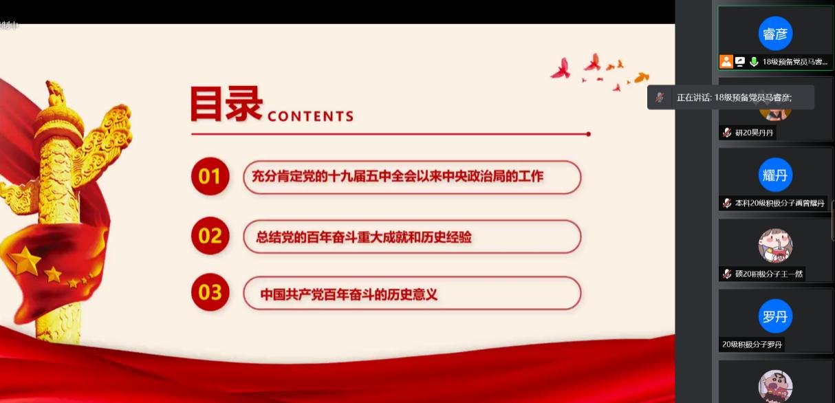 接下来,由本科管理类党支部18级预备党员马睿彦带领大家共同学习 “十九届六中全会精神”。学习从以下三方面展开,一是会议充分肯定党的十九届五中全会以来中央政治局的工作内容,二是总结党的百年奋斗重大成就和历史经验,三是学习中国共产党百年奋斗的历史意义。