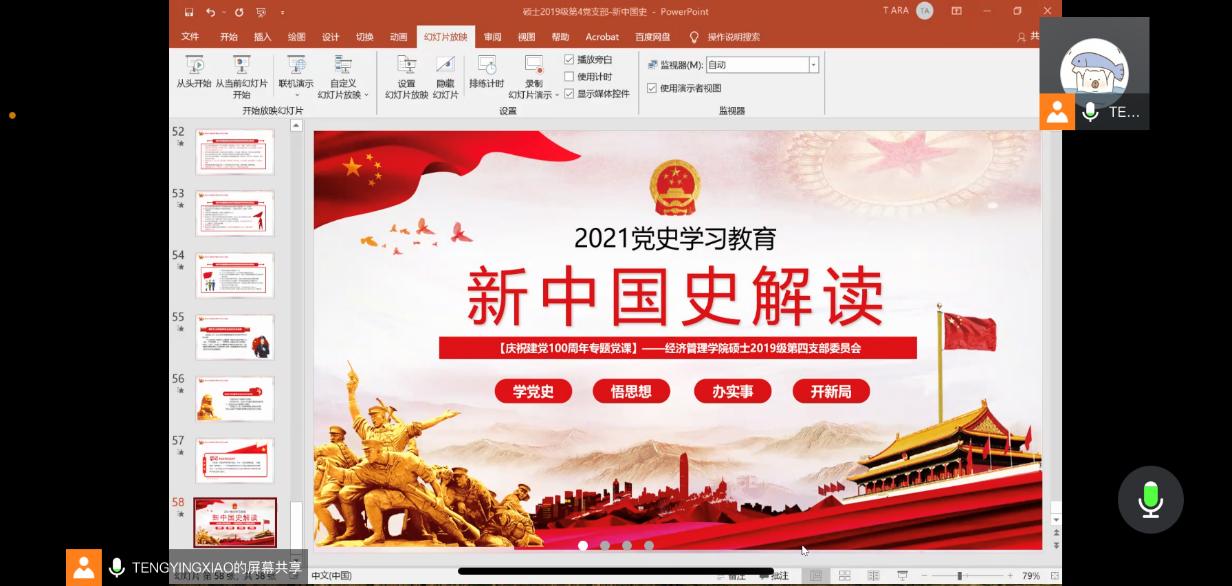 2021年5月18日晚7点,经济管理学院硕士2019级第四党支部开展了云上党组织生活会。本次会议主题为“新中国史解读”,支部全体同志依托腾讯会议平台集中进行了学习。