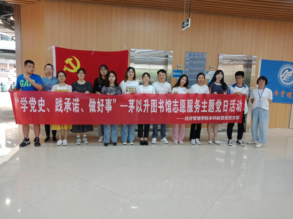 2021年5月28日,本科经贸类党支部党员同志和积极分子以“学党史、践承诺、做好事”为主题,在茅以升图书馆进行学习图书摆放以及图书整理志愿活动。