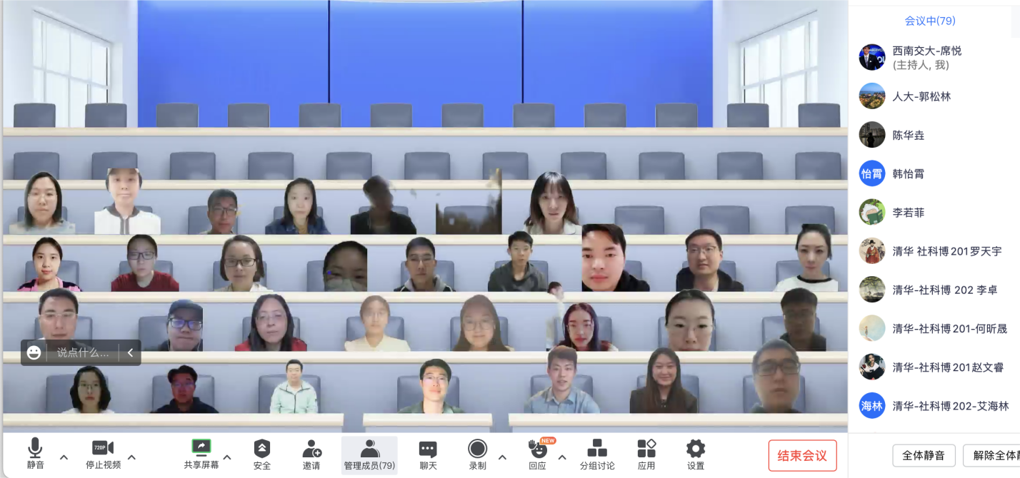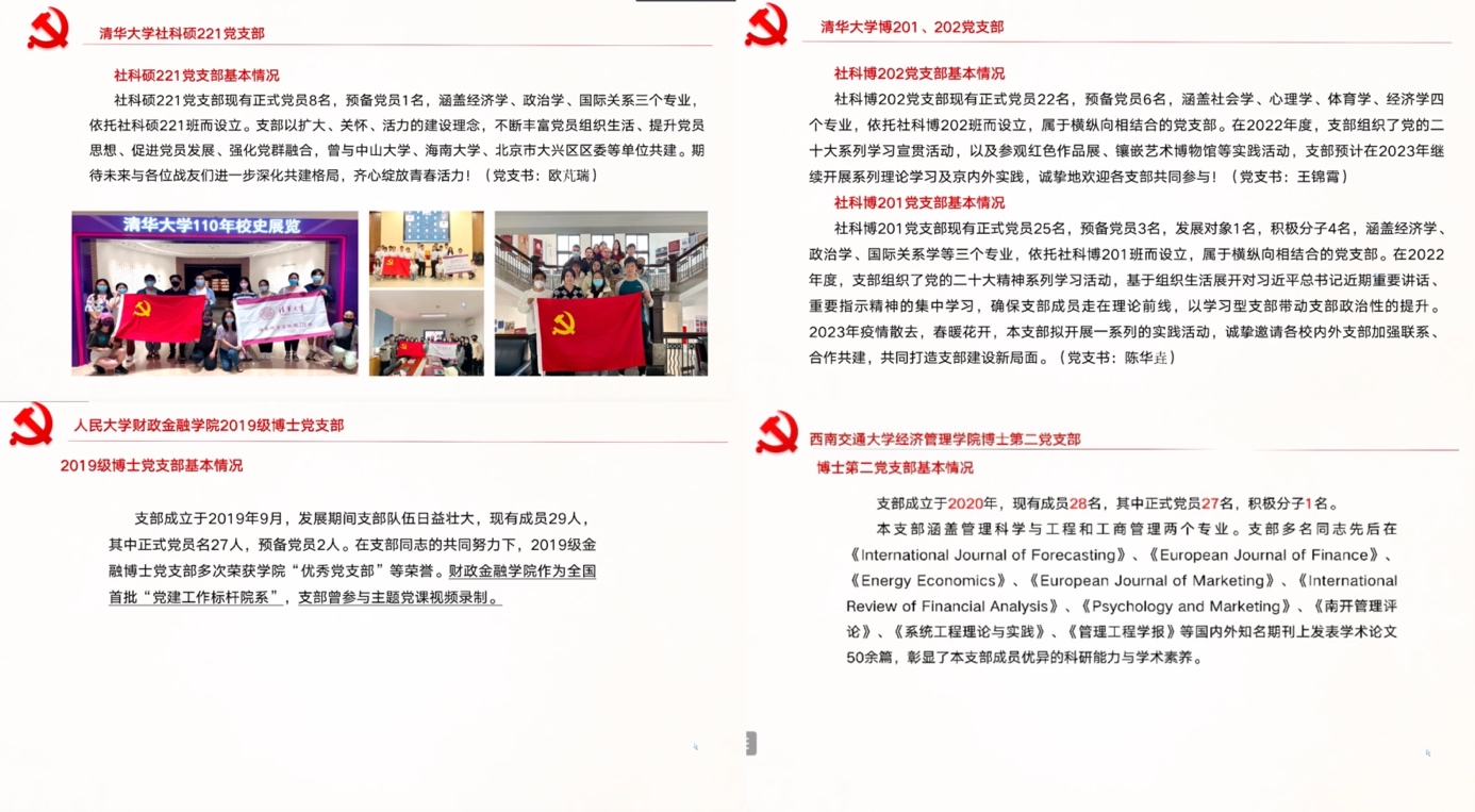 东风浩荡,奋进新程;凝心聚力,奋楫扬帆。为响应全党关于学习“两会”精神的号召,深化支部间联合共建,2023年4月11日晚7点30分,西南交通大学经济管理学院博士第二党支部联合清华大学社科硕221党支部、社科博201党支部、社科博202党支部、中国人民大学财政金融学院2019级金融博士党支部,以线上腾讯会议形式召开“聚焦两会精神内涵,共话青年担当”为主题的支部共建学习活动。此次会议由西南交通大学经济管理学院博士第二党支部书记席悦同志主持,西南交通大学、清华大学和人民大学的五个党支部近百余名党员同志参加了此次活动。