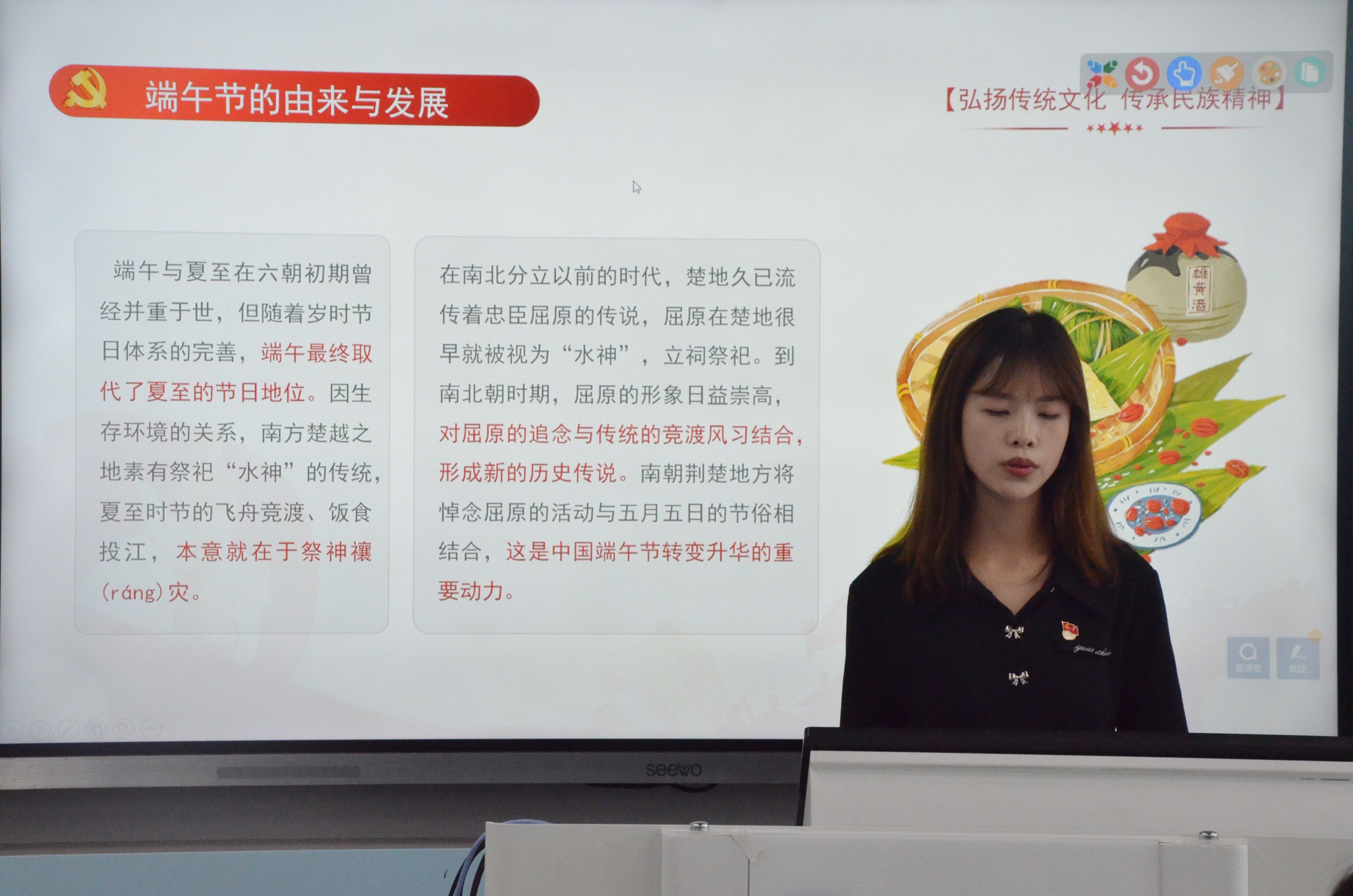 第一部分,由支部宣传委员刘蓉同志带领党支部成员学习端午文化,涵养爱国情怀。通过讲述端午节的由来及其丰富的节日习俗,进一步了解了吃粽子、佩香囊、挂艾叶、系彩丝的含义,使支部成员了解端午节俗承载的精神内涵和现实意义,体会到屈原心忧家国、情牵百姓、清正高洁的人格魅力和思想精髓,深入理解端午节所蕴含的爱国主义深厚底蕴与时代意义,勉励支部党员高举爱国主义旗帜,在新时代新征程中接续奋斗、担当作为。
