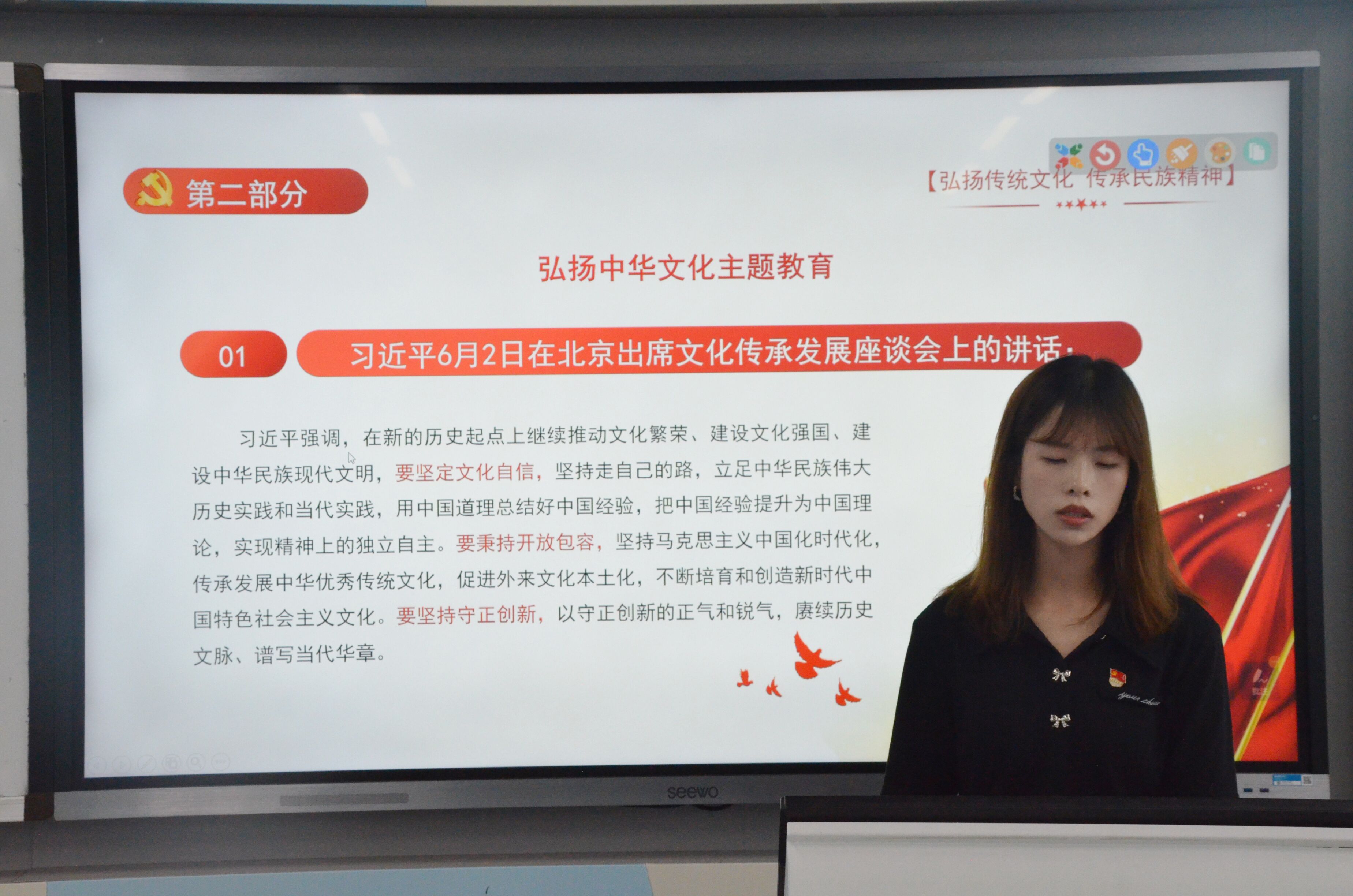 第二部分,为切实将主题教育贯穿支部政治理论学习全过程,刘蓉同志领学了习近平总书记关于弘扬中华文化的重要论述,重点学习了习近平总书记6月2日在文化传承发展座谈会上发表的重要讲话等五项内容。支部成员从中华优秀传统文化中汲取前进力量、坚定文化自信,振奋精神、团结奋斗,决心在实践中大力弘扬中华优秀传统文化,共同努力创造属于我们这个时代的新文化,建设中华民族现代文明。