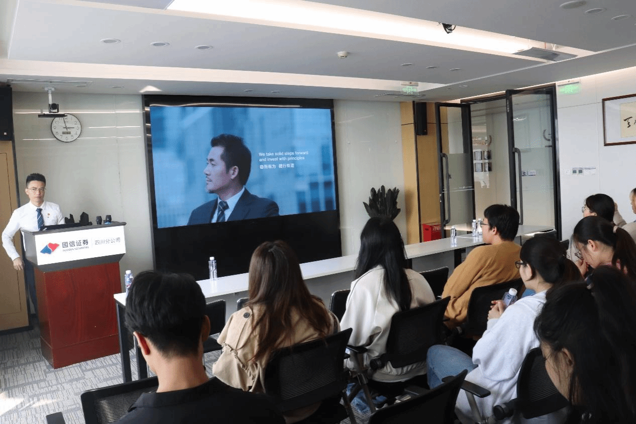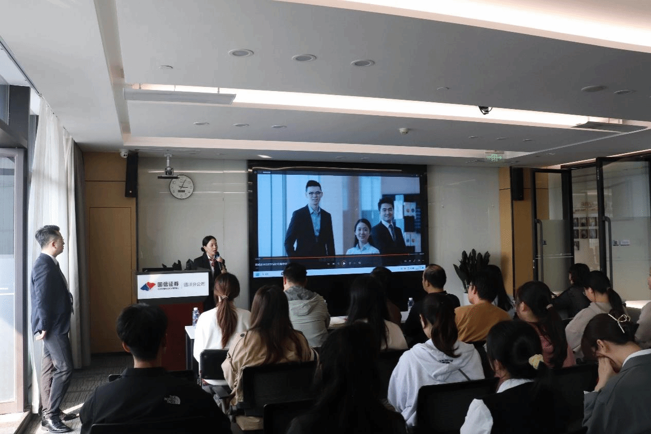 抵达后,国信证券的领导和工作人员热情接待,并对我院师生的到来表示热烈欢迎。随后,大家在工作人员的带领下进入会议室落座,国信证券理财三部的周圆皓经理简要介绍了此次活动的流程,本次党建共建活动正式开始。