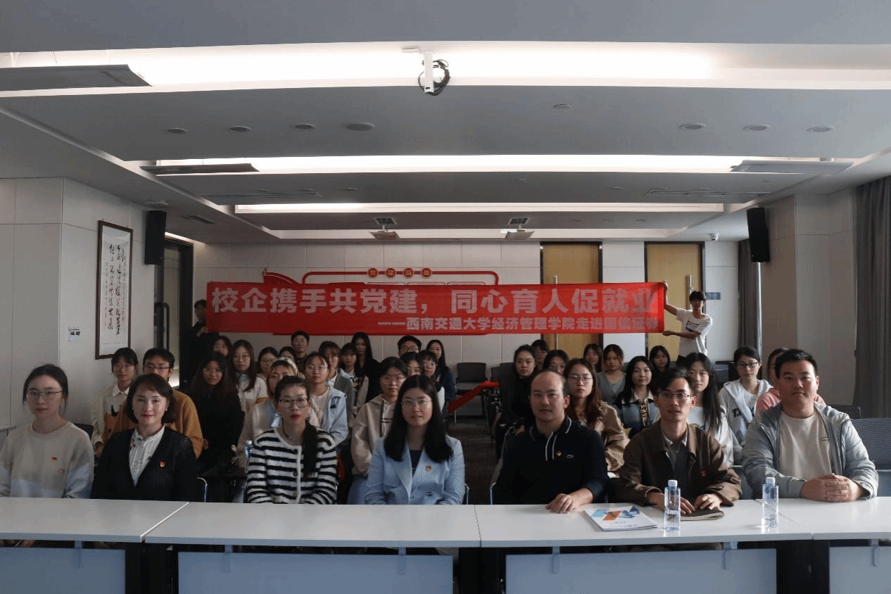 为深入贯彻落实习近平总书记关于党的建设的重要思想,推动党建工作高质量发展,增进支部间交流学习,持续贯彻落实访企拓岗行动,11月9日下午,西南交通大学经济管理学院金融与财务学系教工党支部、本科第三党支部和2023级硕士第二党支部前往国信证券四川分公司开展党建共建活动,通过走访参观、嘉宾分享、交流提问等方式,校企携手共党建,同心育人促就业。经济管理学院党委副书记余小英、团委书记贾佳、金融与财务学系党支部教师代表许自坚、本科第三党支部书记苏扬、副书记张媛媛、研究生辅导员李勇、王重月和各支部成员共同参加。