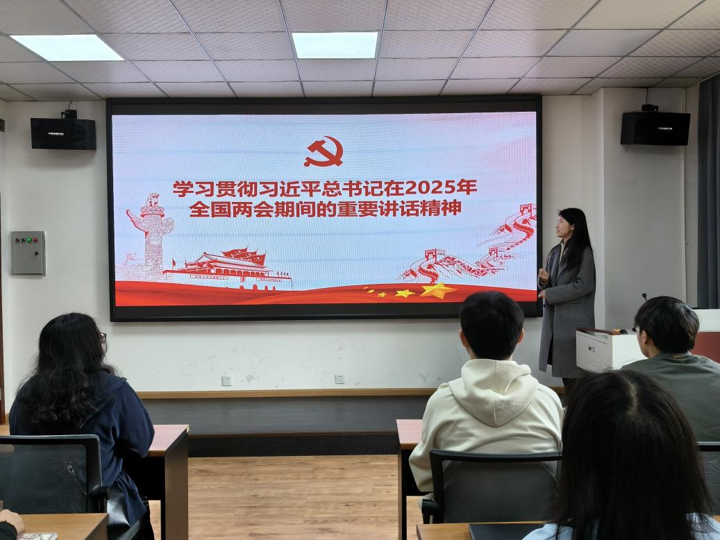 2025年4月8日上午11: 00,为深入学习贯彻习近平总书记在 2025 年全国两会期间的重要讲话精神,引导广大同学深刻领悟两会内涵,将两会精神转化为实际行动,经济管理学院研究生会临时党支部于0318教室开展了“学习贯彻习近平总书记在2025年全国两会期间的重要讲话精神”专题学习活动。
