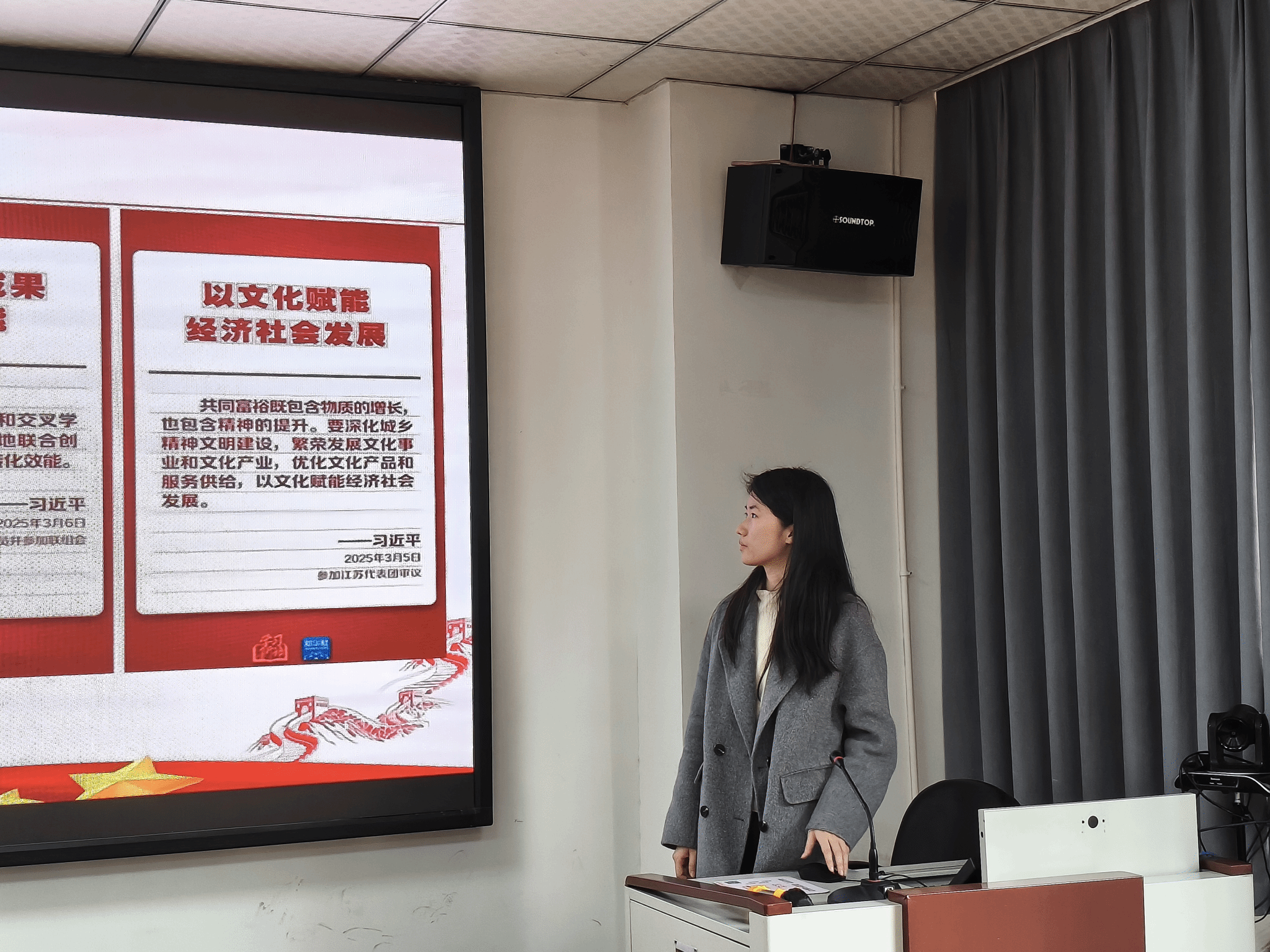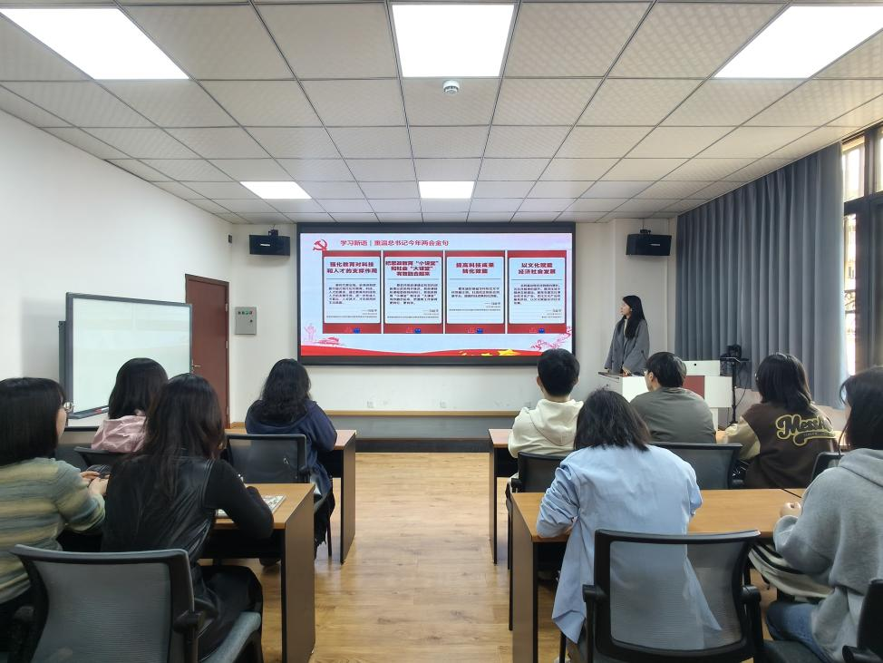 在学习两会金句环节,王睿同学带领大家重温了习近平总书记关于强化教育支撑、融合思政课堂、提高科技成果转化效能、文化赋能发展等金句,引导同学们深入思考这些理念对实际工作和生活的指导意义。