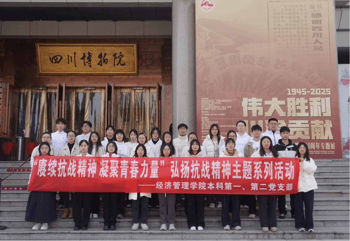 为深化爱国主义教育,传承弘扬伟大抗战精神,增强青年党员的历史使命感与担当意识,2025年11月27日,经济管理学院本科第一、第二党支部及红路研究生理论学讲团成员共30人,赴四川博物院与成都人民公园开展“赓续抗战精神,凝聚青春力量”弘扬抗战精神主题党日活动。