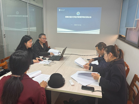 2025年11月14日下午,经济管理学院纪委在0513会议室顺利召开了本年度第三次工作例会。会议由学院纪委书记余小英主持,纪委副书记张震宇及全体纪委委员李海波、何鹏、贾佳出席了会议。